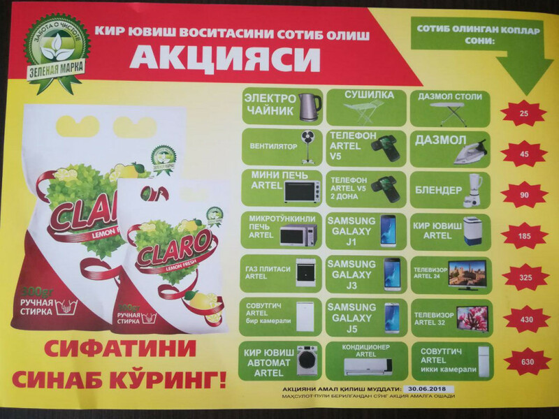 Предприятие производит высоко качественную продукцию: Стиральные порошки, мыло, шампуни, чистящие средства. Выпускаемая продукция реализуется по всей территории Узбекистана, а также на экспорт в такие страны как Казахстан,Киргизистан,Таджикистан,Авганистан и Россия. Имеются гигиенические сертификаты ISO соответствия на всю продукцию. Контроль качества производится на каждом этапе производства от закупки сырья до момента передачи продукции поставщиком. Ассортимент выпускаемой продукции постоянно расширяется с учетом запросов покупателей. Коллектив заинтересован в укреплении и расширении партнерских отношений и дорожит деловой репутацией предприятия.Физическим лицам обращаться на наш диллеру по ташкенте Приглашаем дилеров к взаимовыгодному сотрудничеству.